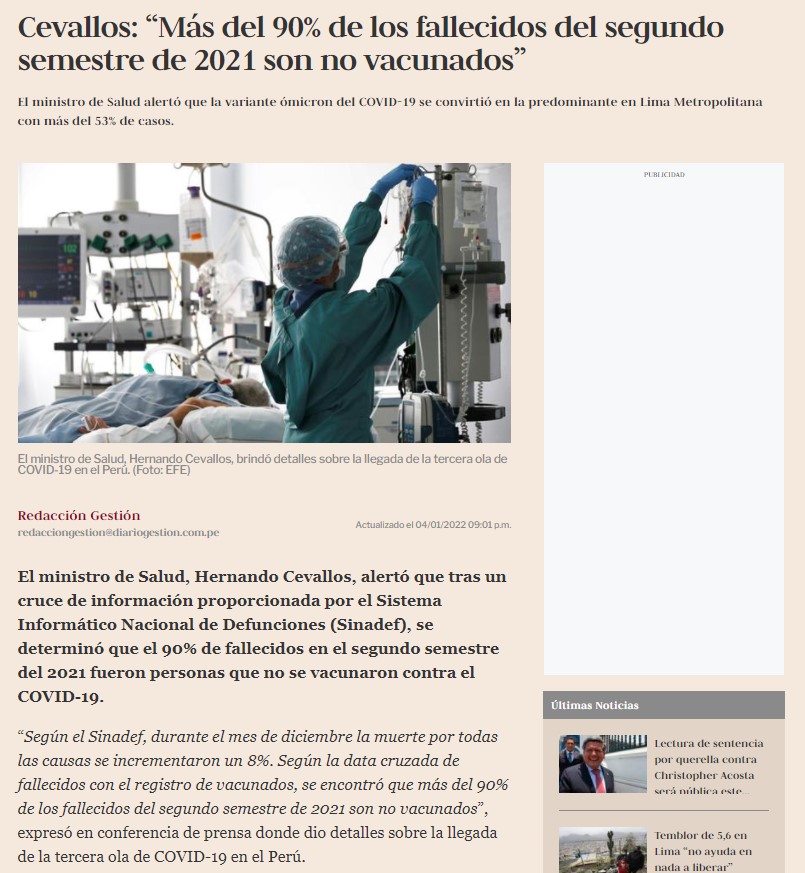 El ministro Cevallos dice que el 90 % de los fallecidos por toda causa en el segundo semestre del año 2021 son no vacunados y esta información es publicada en Gestión (sin ningún esfuerzo por verificar la información). Al ser Gestión un diario con prestigio, casi todos asumen que la información es verdadera, más aún si ya tienen un sesgo a favor de este tipo de noticias. Lo cierto es que es muy fácil saber que esta afirmación es completamente falsa. Basta con revisar los datos oficiales en la Plataforma Nacional de Datos Abiertos (datosabiertos.gob.pe) y verificar que, desde julio de este año, los fallecidos por COVID-19 no vacunados fueron 4935 y, los vacunados (con una, dos o tres dosis), 4263. Es decir, 53.65 % no vacunados y 46.35 % vacunados. Números muy lejanos a lo afirmado por Cevallos. Un mejor análisis podemos verlo en este excelente video, donde se muestra cómo descargar la información y hacer el cálculo, de forma que pueda verificar cualquiera la gran mentira del ministro que publicó Gestión: https://youtu.be/8kwTY5KYDYQ.