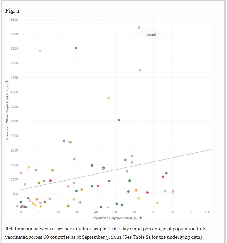 De todas maneras, recomiendo revisar el estudio de S. V. Subramanian, de Harvard T.H. Chan School of Public Health: https://link.springer.com/article/10.1007/s10654-021-00808-7?fbclid=IwAR097Owss2t-mkTOvvvPByzxfEG_zk7XCUdfS5zrbkNUQ189AdpuVEsuW_I#Fig1, donde no encuentran ninguna correlación entre el porcentaje de vacunación en un país y el ritmo de contagios por millón de habitantes. De hecho, la recta de regresión tiene pendiente positiva; es decir, los países con mayor vacunación tienen mayor tasa de contagios (aunque esto último es solo anecdótico porque la correlación es muy baja).
