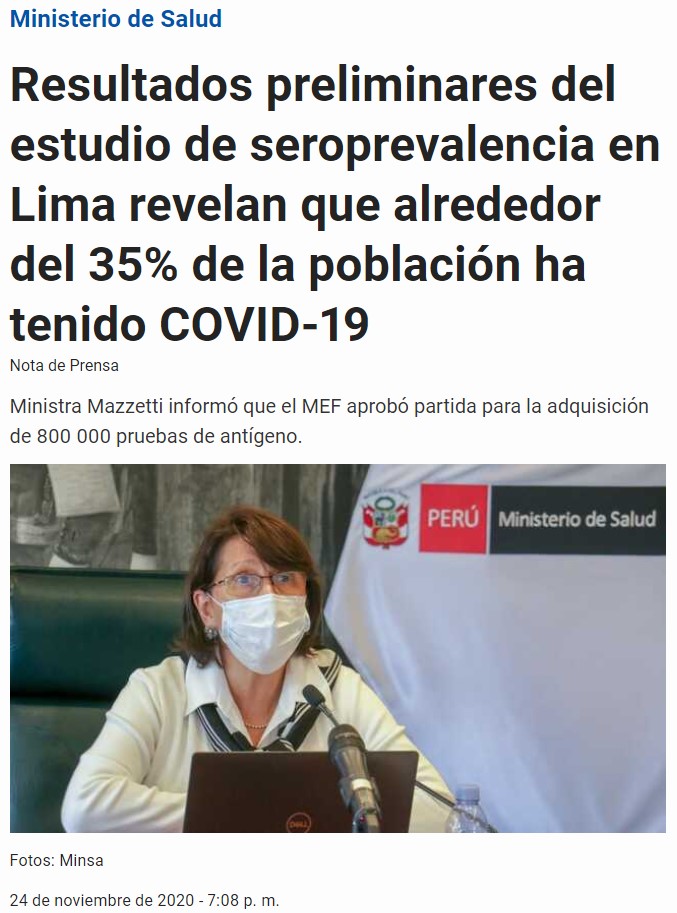 Me enviaron la siguiente nota con respecto al estudio de seroprevalencia: https://elperuano.pe/noticia/112613-cuatro-millones-de-habitantes-de-lima-ya-tuvieron-el-coronavirus. Si bien aún no encuentro la publicación del estudio, la nota de El Peruano indica que 39.6 % de la población de Lima Metropolitana ya había sido tenido COVID-19, un poco más de lo que había adelantado la ministra Pilar Mazzetti.