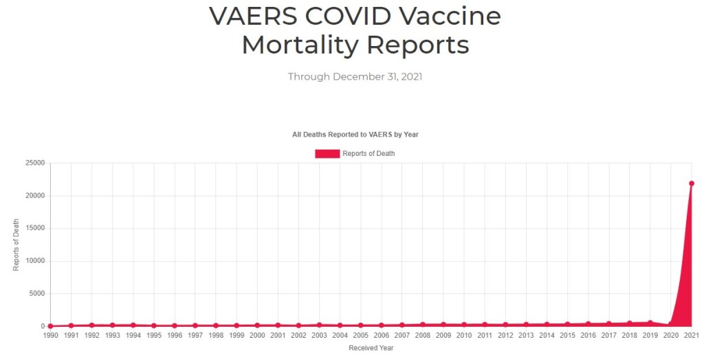 Es sabido que al ser el VAERS un sistema en el que solo se reporta una fracción del total de casos adversos asociados con la vacunación, fracción que puede llegar a solo el 1 % del total, de acuerdo con un estudio de Harvard al que puede accederse en el mismo VAERS (https://openvaers.com/images/r18hs017045-lazarus-final-report-20116.pdf), las 21,382 muertes reportadas por la vacuna del COVID-19 que vemos en el gráfico podrían corresponder a una cantidad de fallecidos por la vacuna de hasta 2,138,200 personas. Por supuesto, tendría que hacerse un análisis adecuado de cuánto fue el factor de casos no reportados para la vacuna del COVID-19, que probablemente no sea tan alto como lo que indicó el estudio de Harvard.